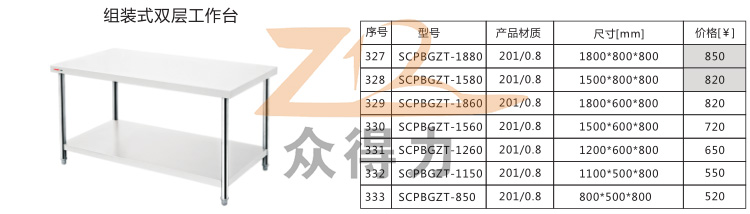 江西眾得力廚具有限公司為您提供中央廚房一站式服務,生產銷售食品機械、商用廚具。本組裝式工作臺有1800型和1500型兩種型號,寬度規格有800mm和600mm可選,板材用料扎實,經久耐用。