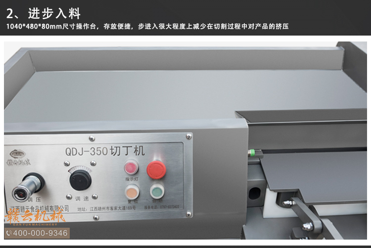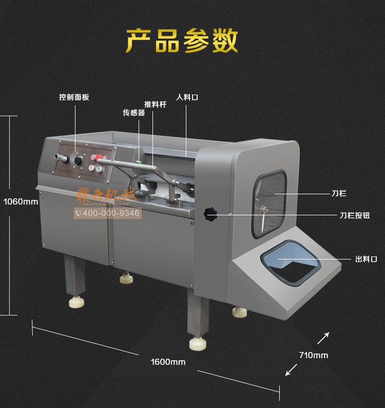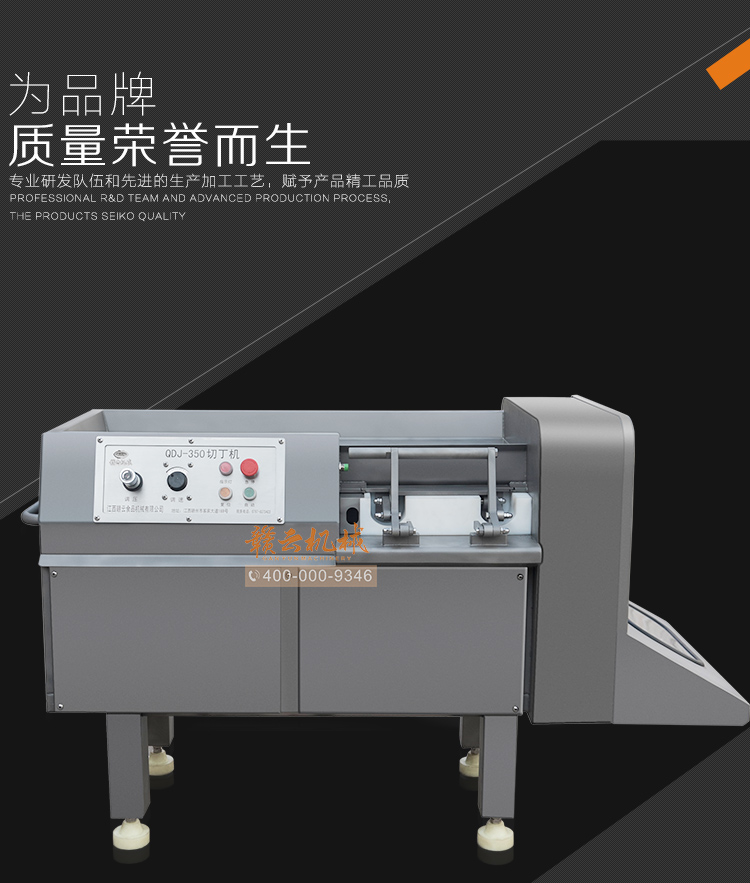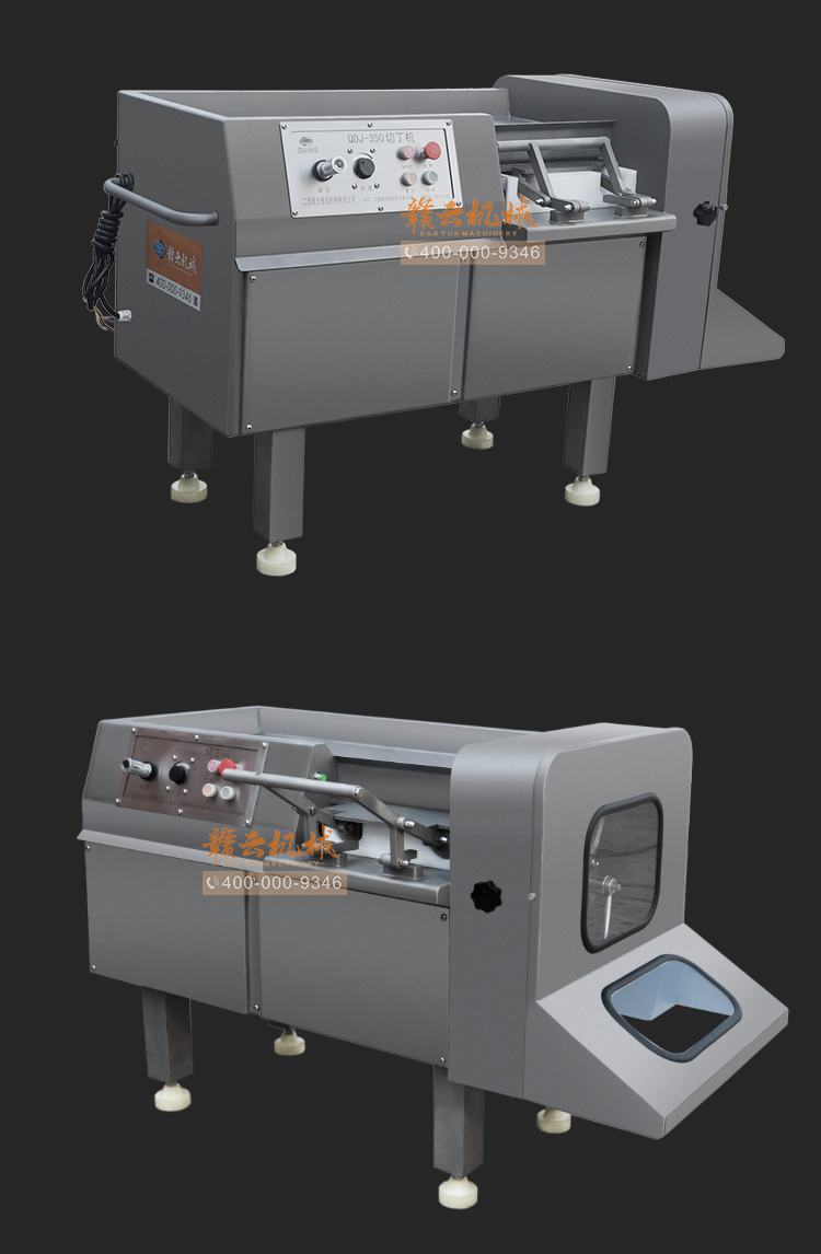 本設備采用全304不銹鋼構架,高級噴砂處理,激光雕刻,利用液壓推料設計,步進式進料,全自動切割,配合日本原裝進口刀具,鋒利切割,速度快,切割長度可調,寬度規格可定制,并配備安全感應雙保護設置,整體外形美觀大氣,是肉類食品加工專用切丁設備。
